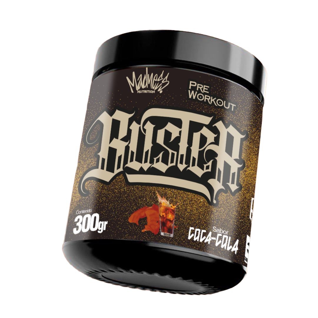 Pre-entreno BUSTER con 300 g y 30 servicios, combinación de estimulantes, beta alanina y clembuterol vegetal para energía, enfoque y bombeo. Sabores: Sandía, Lichi, Mango y Coca cola.